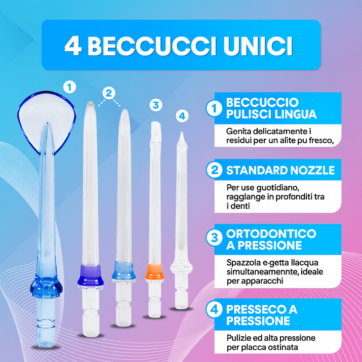 Risposta 1: I getti d’acqua ad alta pressione rimuovono residui e placca anche tra i denti e lungo le gengive, per un sorriso più pulito e sano.